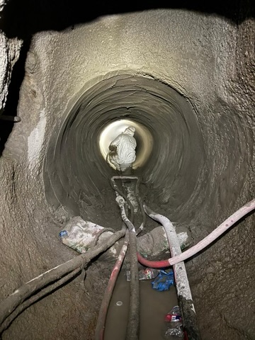 They steadily moved along the length of the sewer accessing at the already-in-place manholes. Each time they reached a new section, the staging, preparation and mixing area was moved to next to the manholes to allow for as short a distance as possible for the Geopolymer to be piped.
